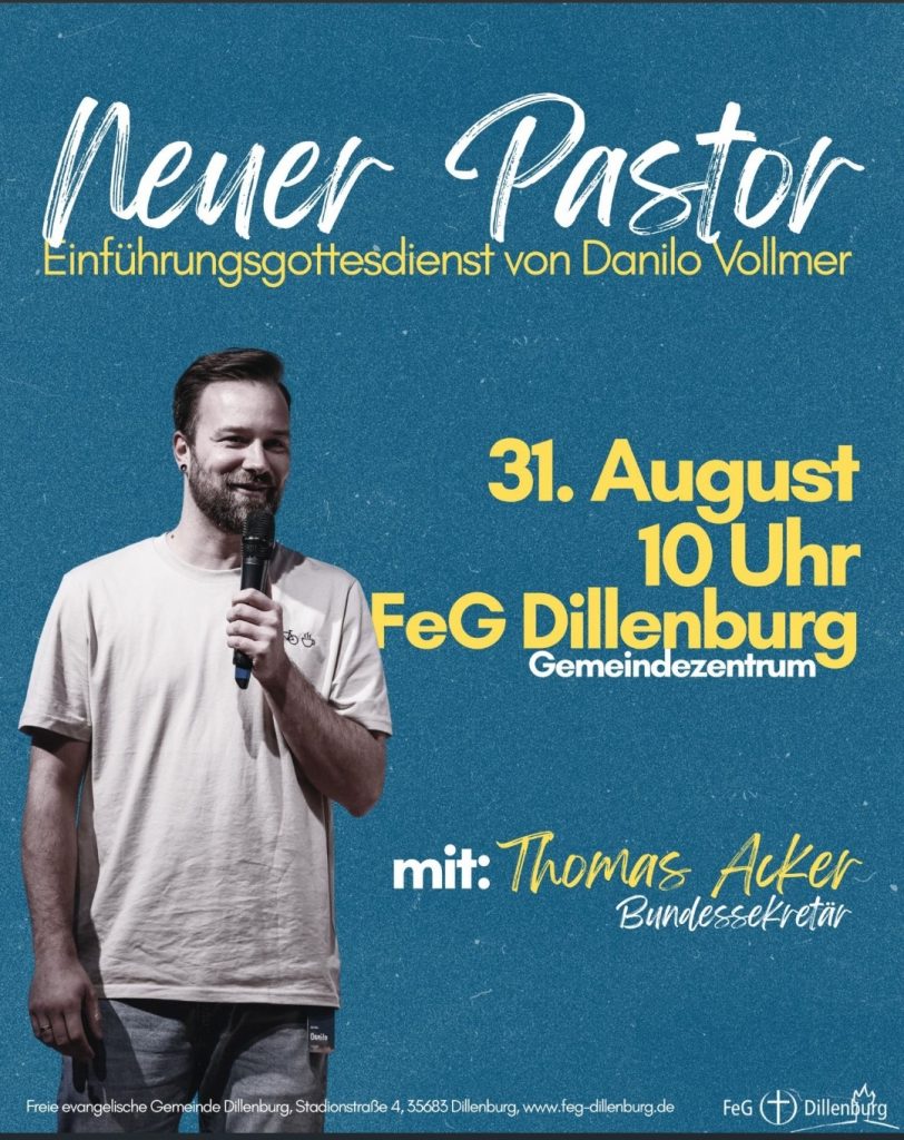 Die Freie evangelische Gemeinde (FeG) Dillenburg lädt für Sonntag, den 31. August 2025 zum Festgottesdienst anlässlich der Einführung des neuen Pastors Danilo Vollmer ein.